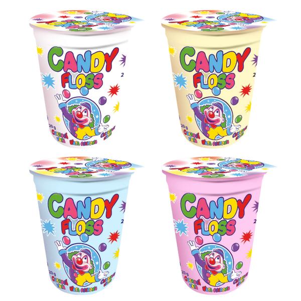Candyfloss Klovn 20g omfatter en bøtte med et farverigt klovnemotiv, som indeholder 20 gram candyfloss. Produktet fås i fire forskellige farver og smage: hvid med vaniljesmag, gul med banansmag, lyserød med jordbærsmag samt blå med tutti frutti-smag. Candyflossen sælges usorteret og stykvis, så hvilken smag du får, bliver en overraskelse.
