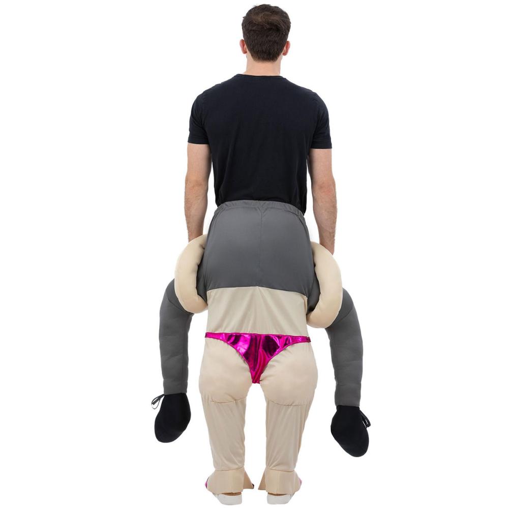 Carry Me Stripper Kostume omfatter et sjovt piggyback-kostume udformet som en stripper, der "bærer" dig på ryggen. Kostumet bæres som et par bukser og har polstrede ben, hvilket skaber illusionen af, at stripperen faktisk bærer dig, mens du går rundt. Hun har neongult hår, neonpink undertøj og motiver af grønne dollarsedler stukket ned i trusserne.