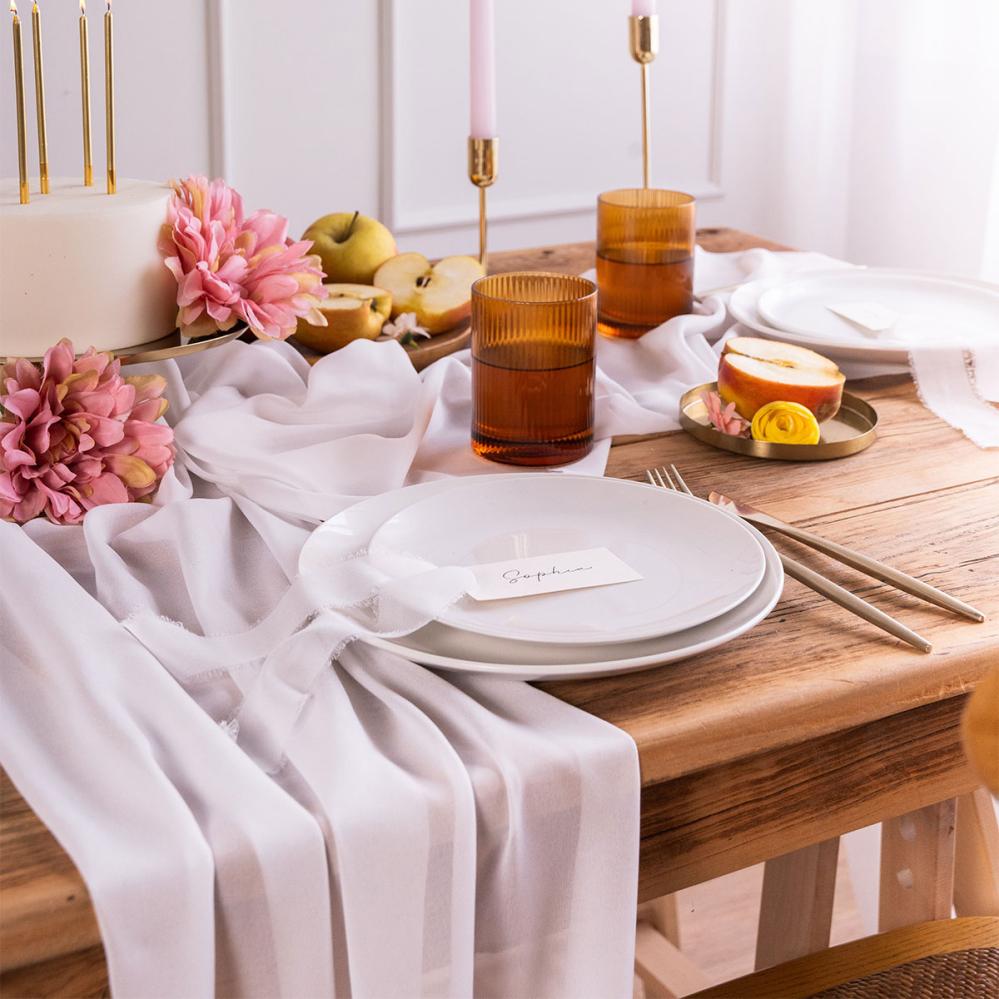 Med en bordløber på rulle får du nemt en hvid borddækning som passer perfekt til bryllupper og andre festlige lejligheder. En bryllupsborddækning med chiffon i elfenbenshvid giver et romantisk og lyst indtryk på alle borde.