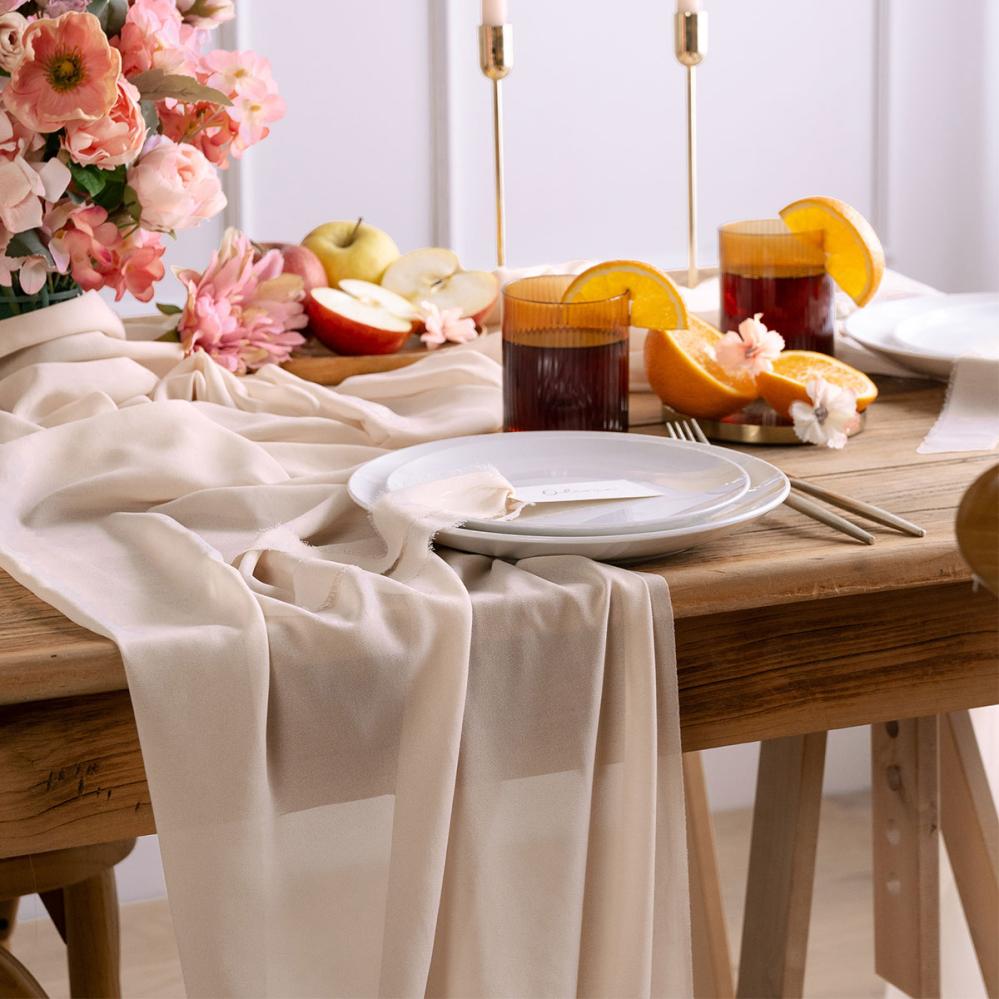 At dekorere til et smukt bryllup bliver let med en bordløber på rulle, hvor den hvide nuance passer lige godt til en elegant opdækning som til ceremonien ved brylluppet. Bryllupsopdækningen får et lyst og blødt indtryk af chiffonens fine materiale.