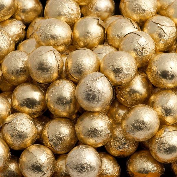 Chokolade Kugler Guld omfatter 500 gram chokoladekugler af mælkechokolade, der er indpakket i fint guldfolie.