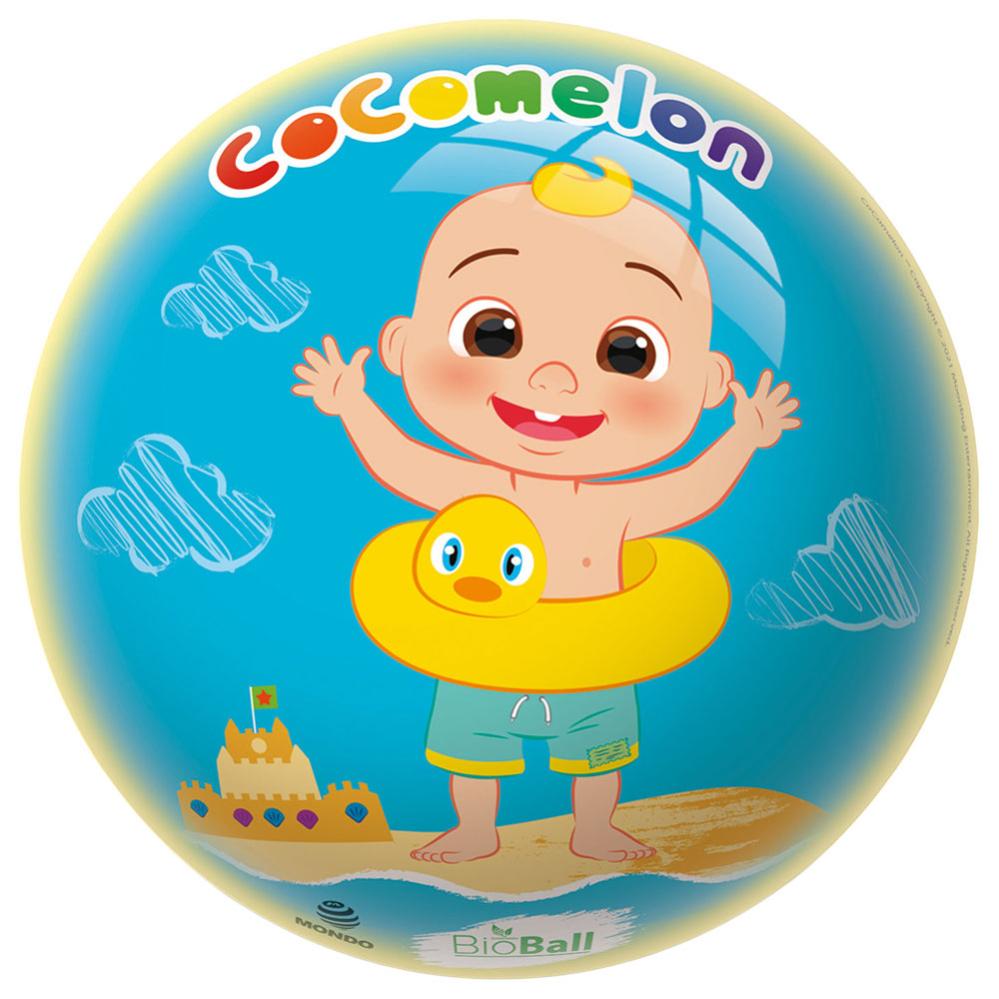 Cocomelon Bold omfatter en blå bold i plast med motiver af de kendte karakterer fra Cocomelon serien på begge sider af bolden. Motiverne på bolden har et strandtema, og der står også 'Cocomelon' på den ene side og 'Happy Sunny Day!' på den anden.
