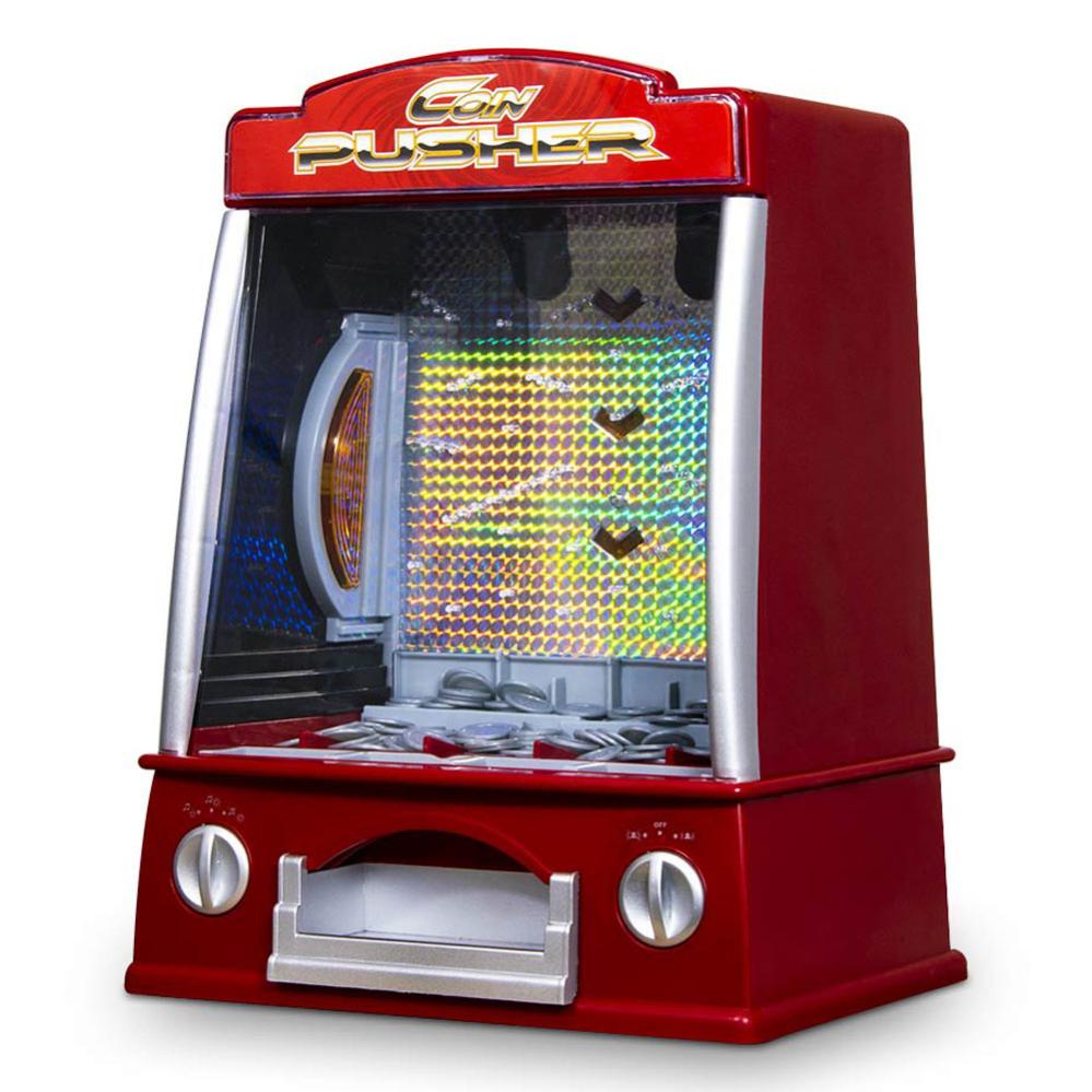 Udfordre dig selv eller måske en ven og se, hvem der kan vinde mest penge med denne sjove Coin Pusher maskine! Sjov spilleautomat, hvor det gælder om at få mønterne til at falde over kanten for at vinde dem. Maskinen leveres også med sølvfarvede plastikmønter, så du ikke behøver at bruge rigtige penge. En virkelig underholdende spilleautomat til fester og leg.