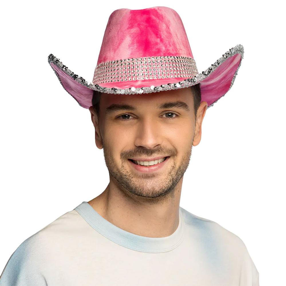 Cowboyhat med Rhinsten og Pailletter Lyserød omfatter en lyserød cowboyhat i fløjlslignende materiale, dekoreret med et bånd af sølvfarvede rhinsten rundt om og en sølvfarvet kant med pailletter.