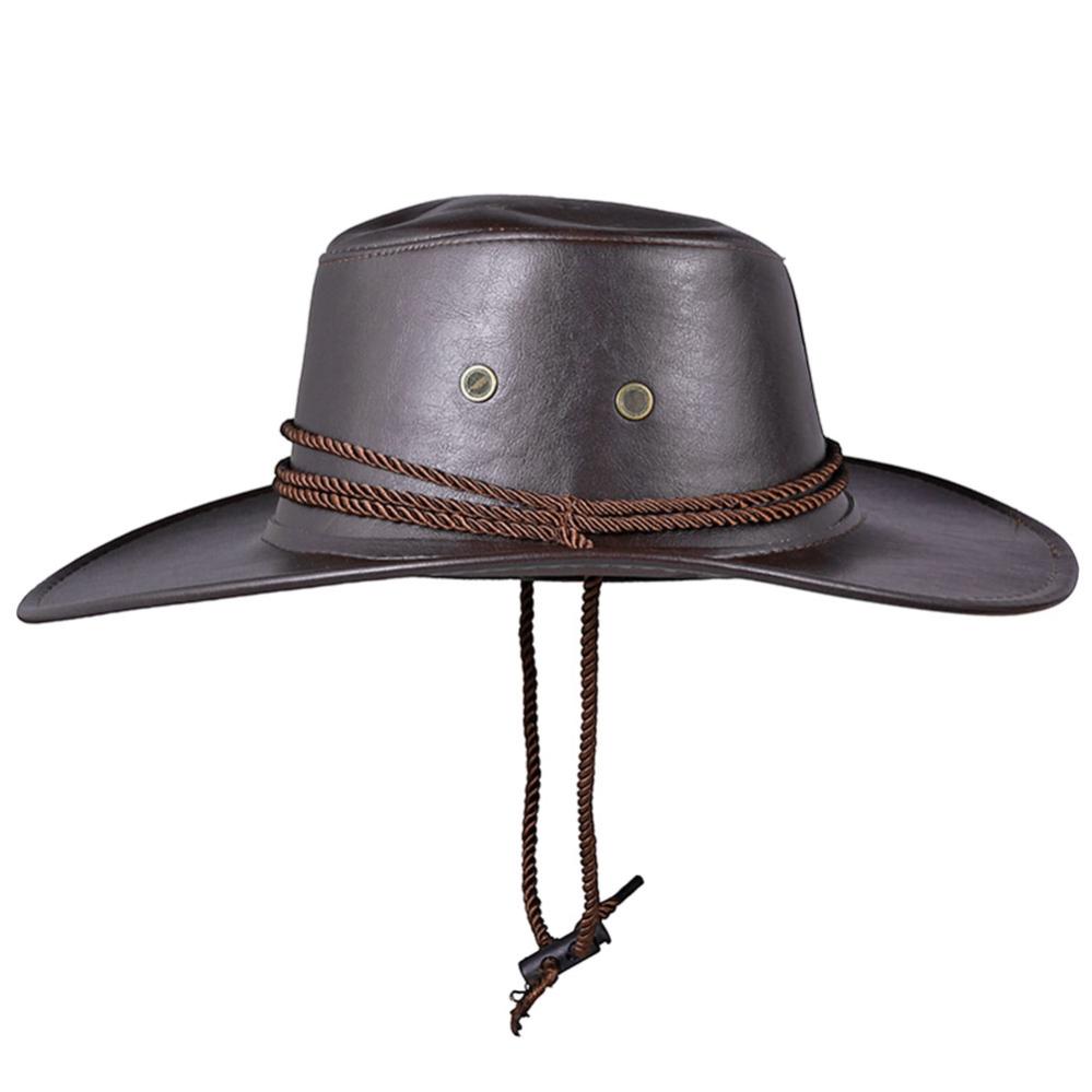Cowboyhat Mørkebrun omfatter en brun westernhat i læderlignende polyester. Hatten har en sort snor, der bindes under hagen.