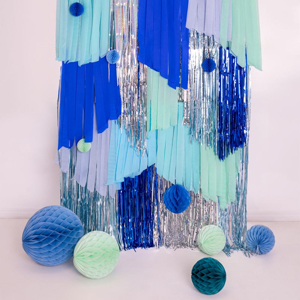 Crepepapir Blå/Grøn 6-pak indeholder seks ruller crepepapir i fem forskellige nuancer af blåt og grønt.
