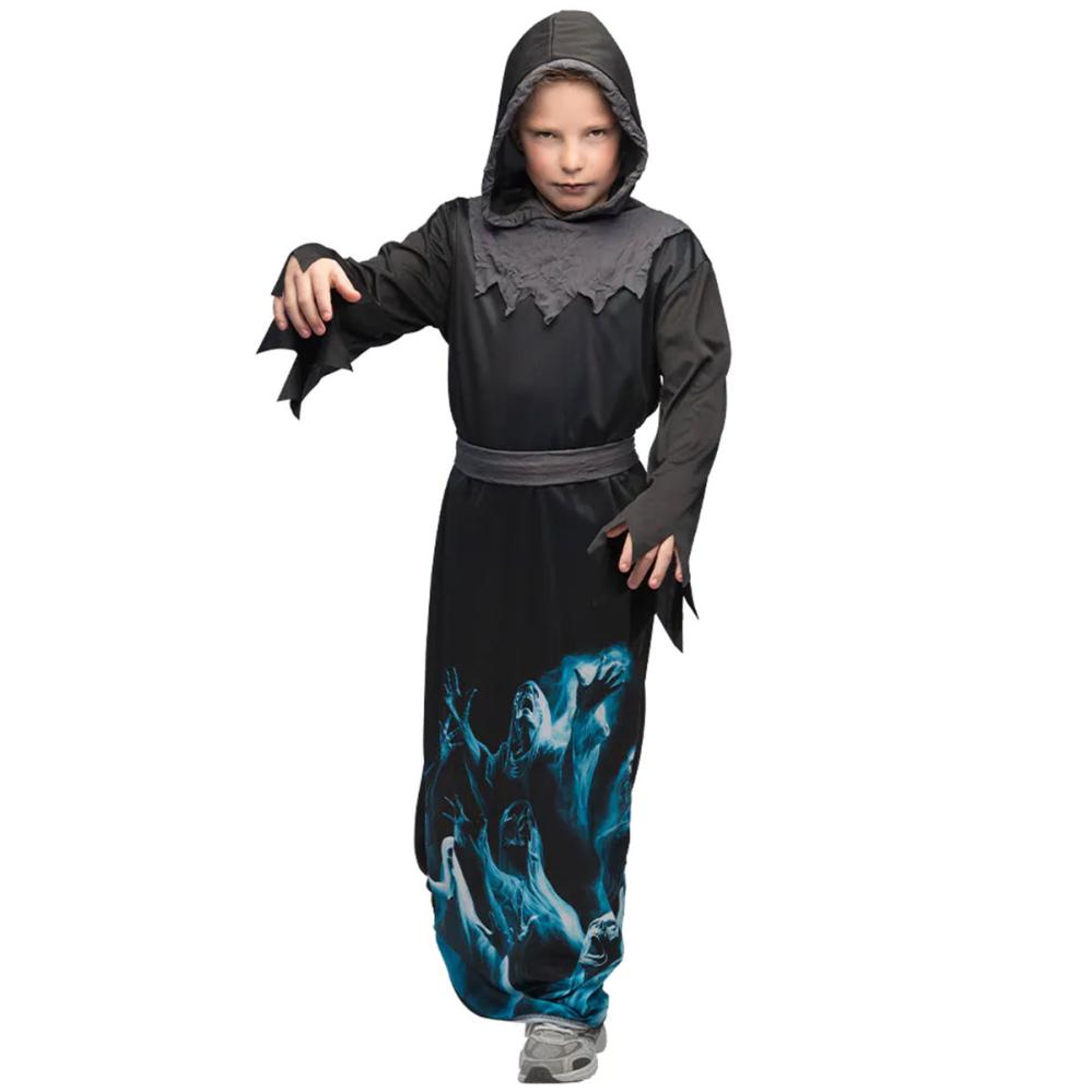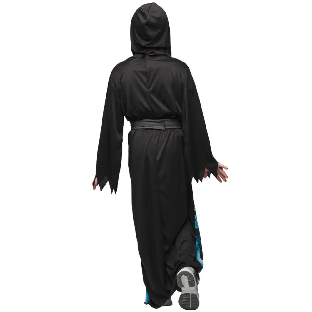 Dæmonisk Manden med Leen Børn omfatter en sort tunika med hætte og lange ærmer med takkede kanter. Dragten er dekoreret med blå spøgelser.