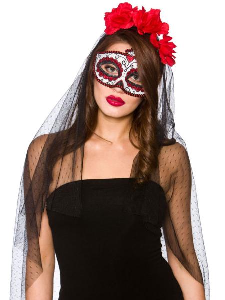 Day of the Dead Øjenmaske med Slør inkluderer en hvid plastmaske dekoreret med sorte krøller og røde glitrende rosenblade. Der medfølger også et diadem prydet med røde roser og en fastgjort, lang sort slør.