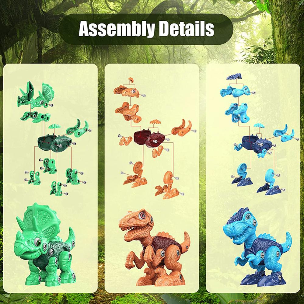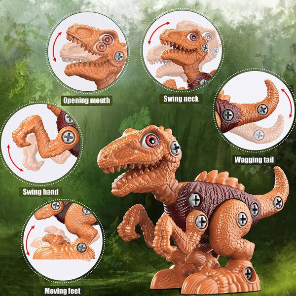 Dinosaur Planet DIY Legetøj Sæt inkluderer et DIY-sæt med tre dinosaurer, som du selv kan samle med den medfølgende boremaskine og plastikskruer. Trin for trin instruktioner til, hvordan delene skal skrues sammen, findes på bagsiden af pakken. Dinosaurernes hænder, ben, fødder og hoved kan bevæges, efter de er samlet. Boremaskinen drives af to AA-batterier. Findes i forskellige farver, hvilke du får bliver en overraskelse.