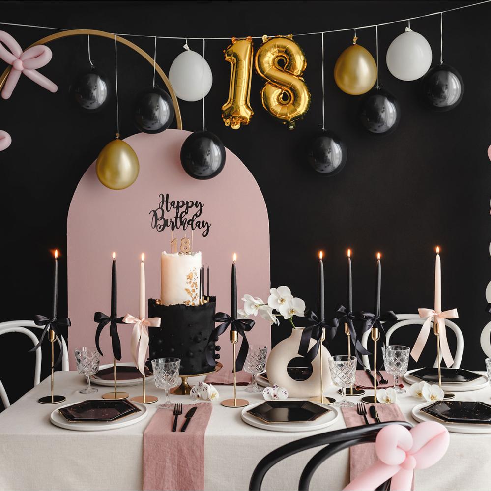 Disse to store talballoner i guld bidrager til fødselsdagsdekorationer som virkelig løfter feststemningen. Med balloner i sort og guld kan du skabe smukke guirlander som passer perfekt som dekoration til en 18 års fødselsdag. De medfølgende fødselsdagsballoner udgør fleksible ballonguirlander.