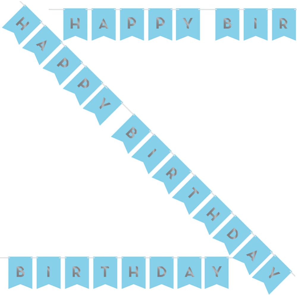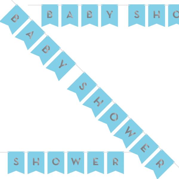 DIY Flagguirlande Sølv og Lyseblå indeholder en DIY guirlande med 13 lyseblå flag og 26 sølvfarvede klistermærkebogstaver, der kan danne en af teksterne "Tillykke med fødselsdagen", "Baby Shower", "Skål" eller "Fejr". Guirlanden er ca. 176 cm lang, og flagene er ca. 15,2 cm høje og 11,5 cm brede. De medfølgende bogstaver er A, B, C, D, E, F, H, I, L, U, P, R, S, T, W, Y.
