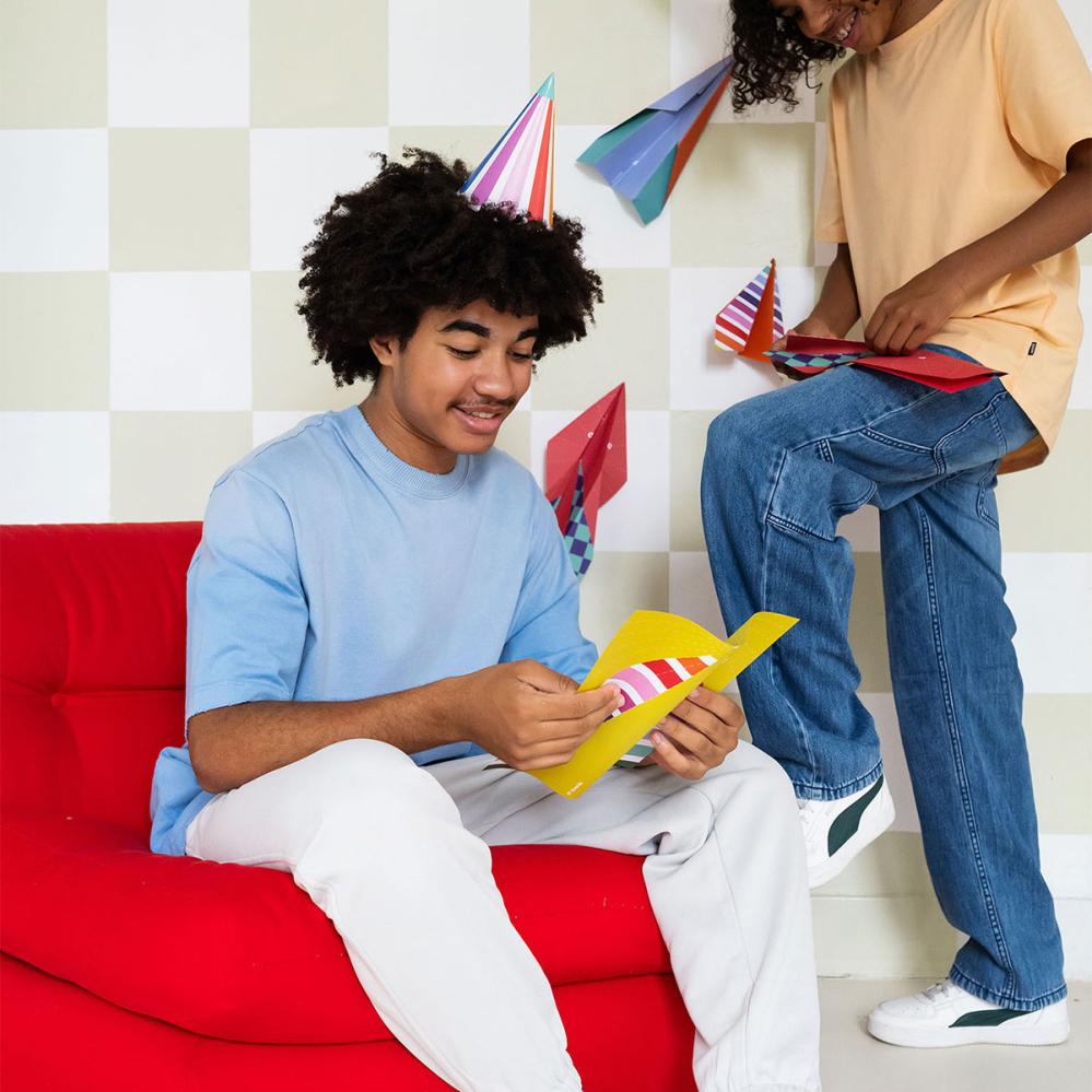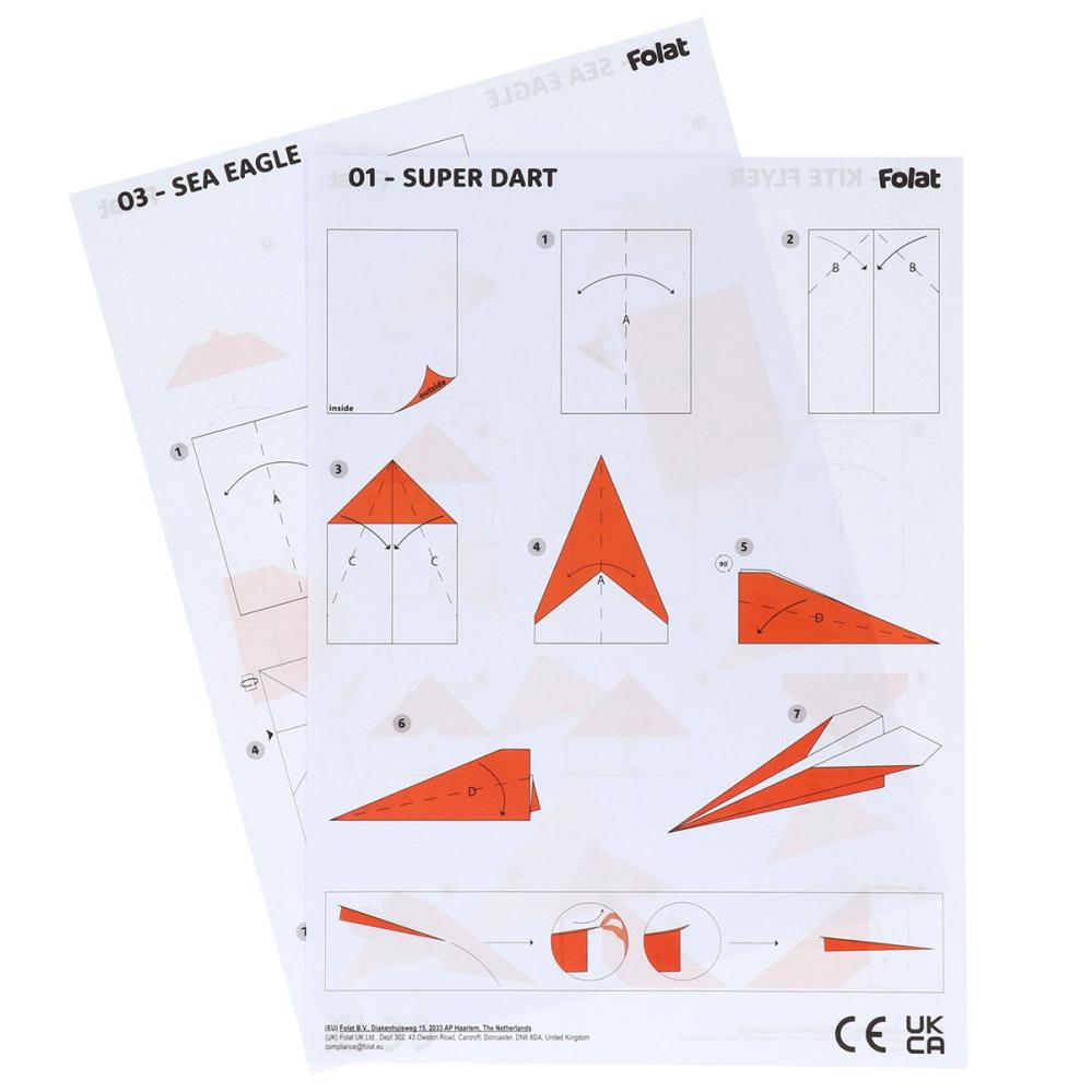 DIY Papirfly Stripetastic 12-pak omfatter et sæt med tolv foldeark til at folde forskellige typer papirfly. Hvert ark har et farverigt tryk på begge sider og tydelige foldelinjer. Der medfølger også ark med tydelige instruktioner til at folde flyene.