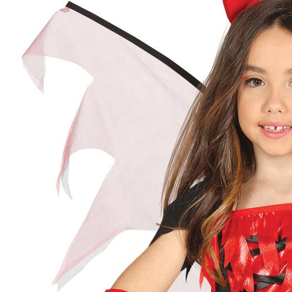 Djævel Kostume Børn 5-pak omfatter en sort og rød djævle-børnedragt med en kjole, matchende ærmer, et rødt diadem med djævlehorn, en hale samt sorte og røde vinger i netstof.