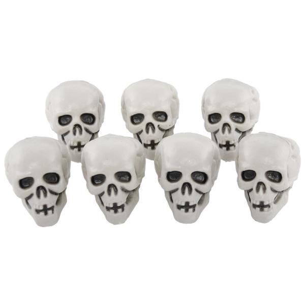 Dødningehoved Dekoration 8-pak omfatter en dekoration i form af otte grå dødningehoveder med sorte detaljer.
