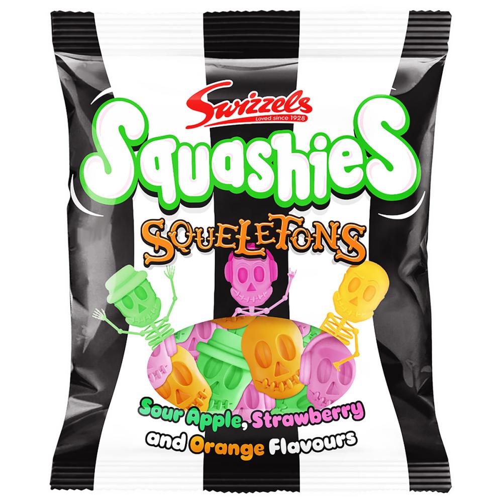 Dødningehoveder Skumgodter Frugt 120g omfatter en slikpose med 120 gram skumgodter i form af forskellige dødningehoveder med smag af syrligt æble, jordbær og appelsin.
