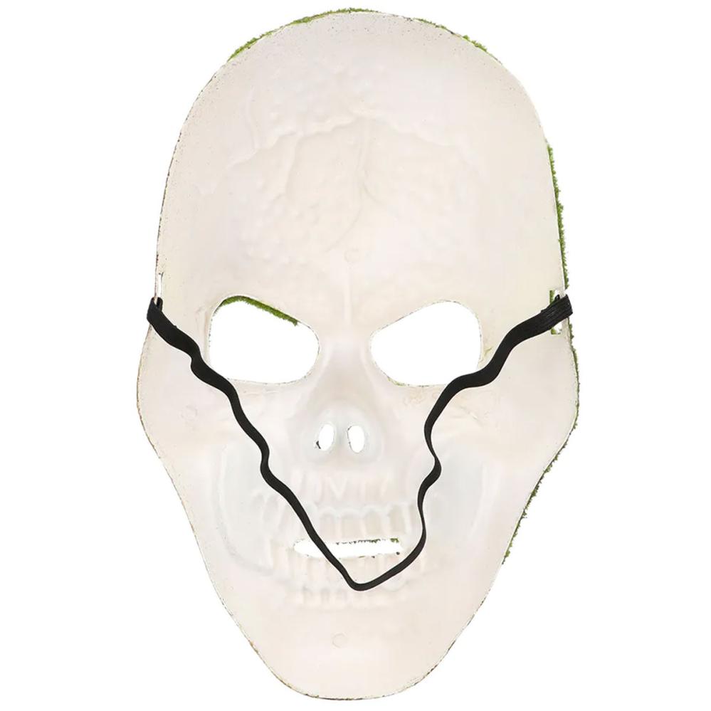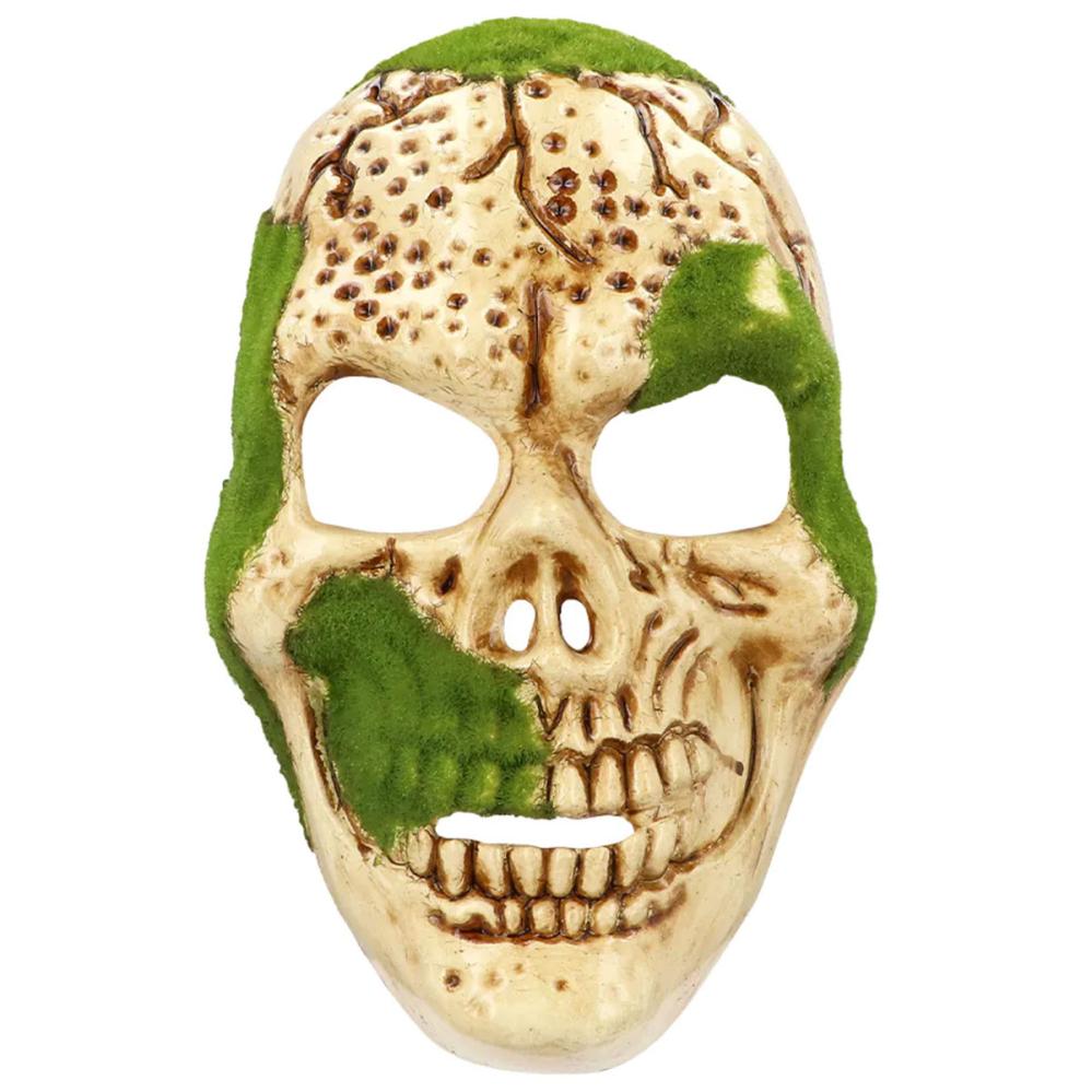 Dødningehovedmaske Natur omfatter en maske, der forestiller et beige dødningehoved, som er blevet overvokset af naturen og har revner, snavs og grøn mos. Masken holdes på plads med et sort elastisk bånd.
