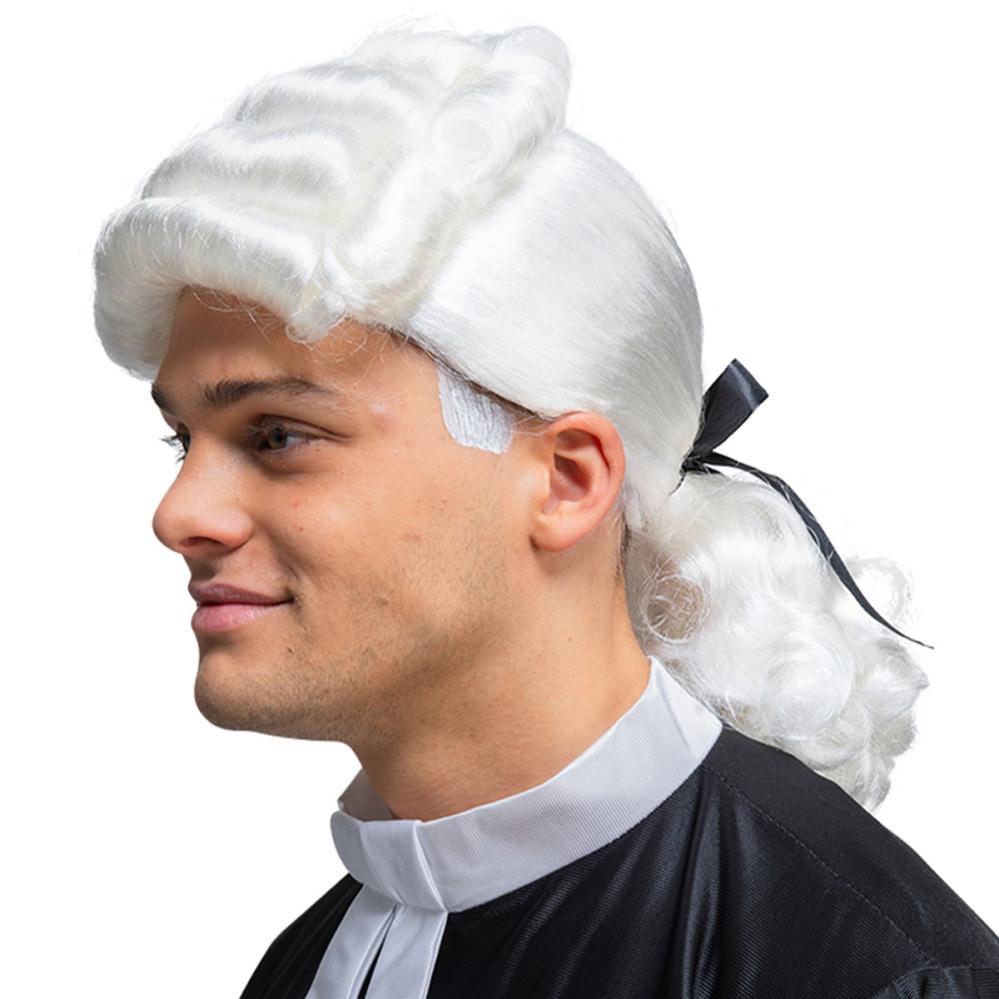 Dommerparyk Hvid omfatter en hvid dommerparyk i stil fra den britiske kolonitid. Parykken har en hestehale, der er bundet med en sort sløjfe, og et luftigt netfor, som hjælper med at holde parykken på plads.
