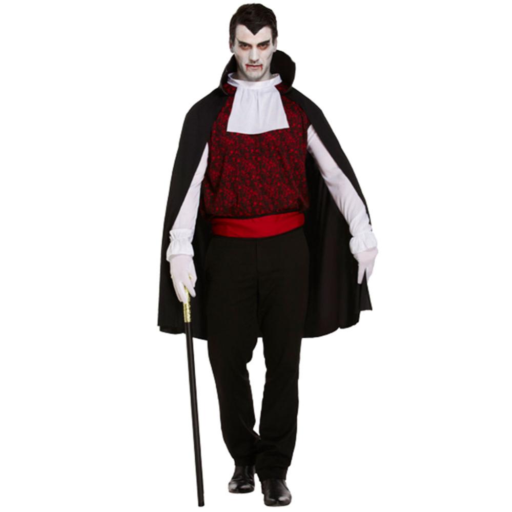 Dracula Vampyrkostume omfatter en sort og rød trøje med lange hvide ærmer samt en fastgjort hvid jabot. Desuden medfølger en mellemlang sort kappe med krave og et rødt bælte.