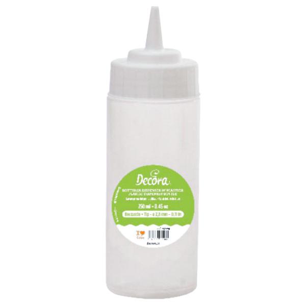 Dressingflaske 250 ml består af en flaske med pip til glasur, chokolade, ketchup og flydende saucer. Den er lavet af plastik, rummer 250 milliliter og måler cirka 17 centimeter i højden.