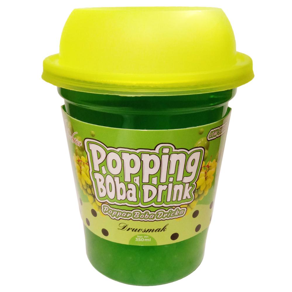 Druedrik med Popping Boba 350 ml er en druedrik med popping boba i et plastbæger på 350 ml med et papirsugerør.