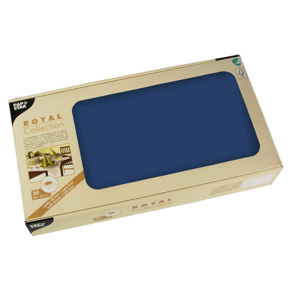 Duge Royal Collection Mørkeblå omfatter en pakke med 20 mørkeblå engangssnippe-duge. Dugene er lavet af stoflignende papir og er ca. 80 x 80 cm store.