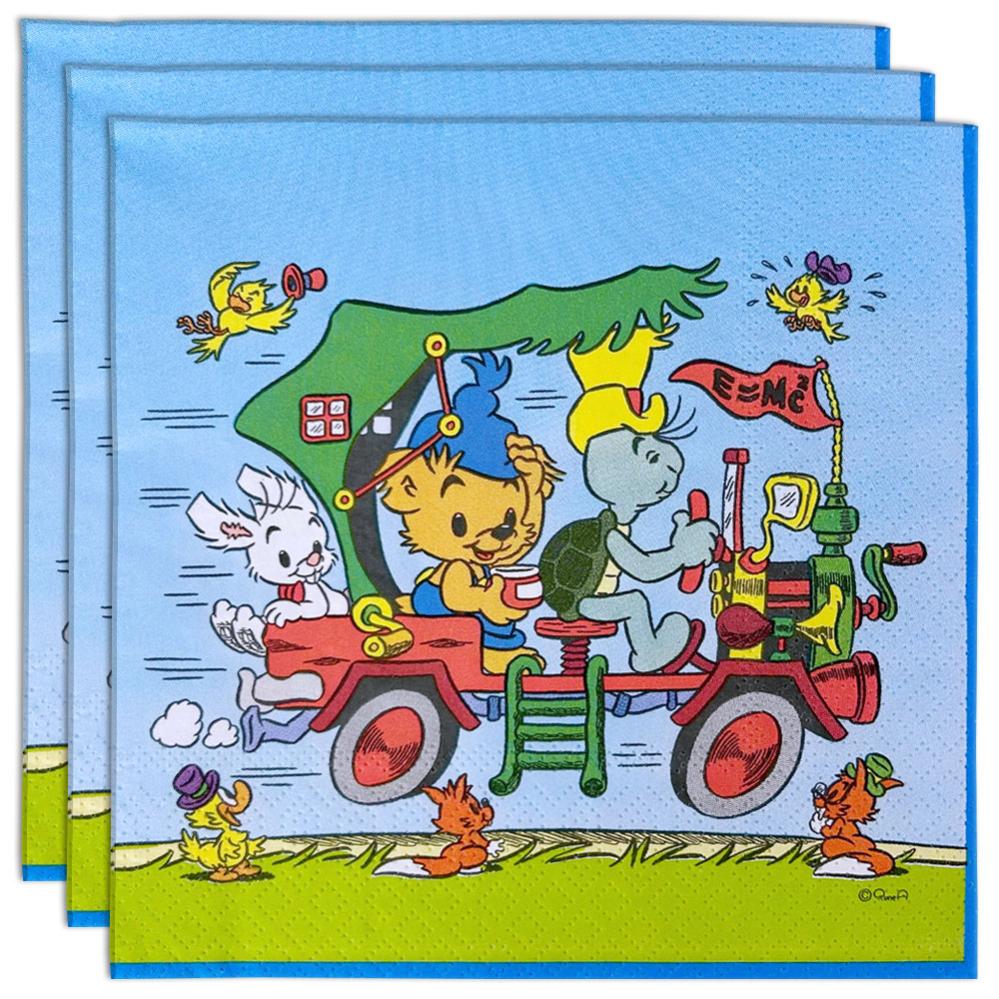 Engangsservietter Bamse Bil 16-pak indeholder seksten blå papirservietter i tre lag med motiv af Bamse og Lille Skutt i bilen som køres af Skalman.