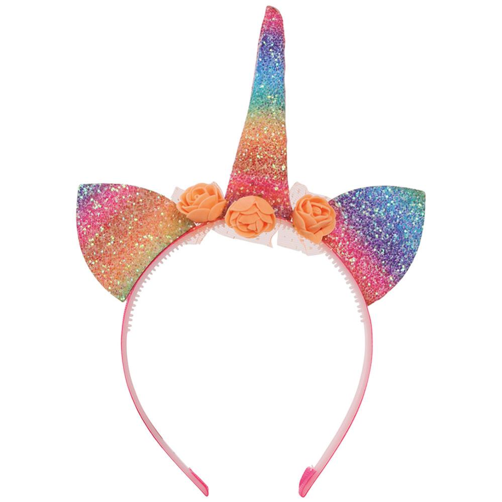 Enhjørning Hårbøjle med Blomster omfatter en lyserød hårbøjle med et enhjørningehorn og ører i regnbuens farver samt tre kunstige blomster i lys ferskenfarve.