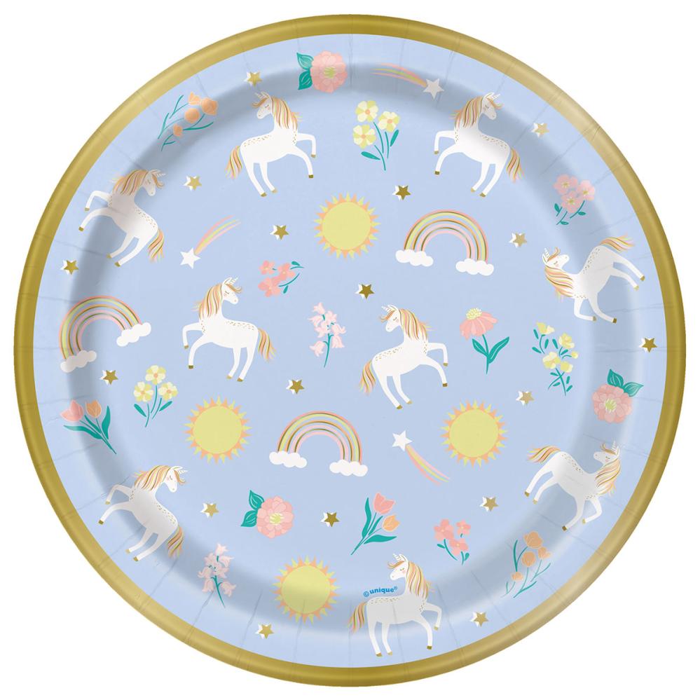 indeholder otte paptallerkener i blåt med en guldfarvet kant og motiv af hvide enhjørninger, blomster i gult, fersken og lyserosa, stjerneskud, regnbuer, sole og guldfarvede stjerner.