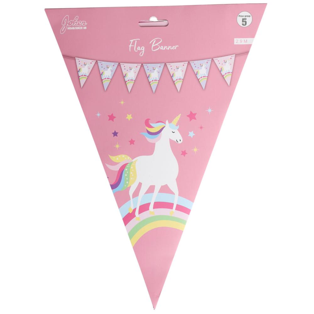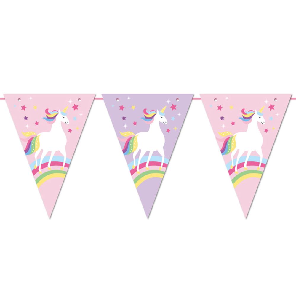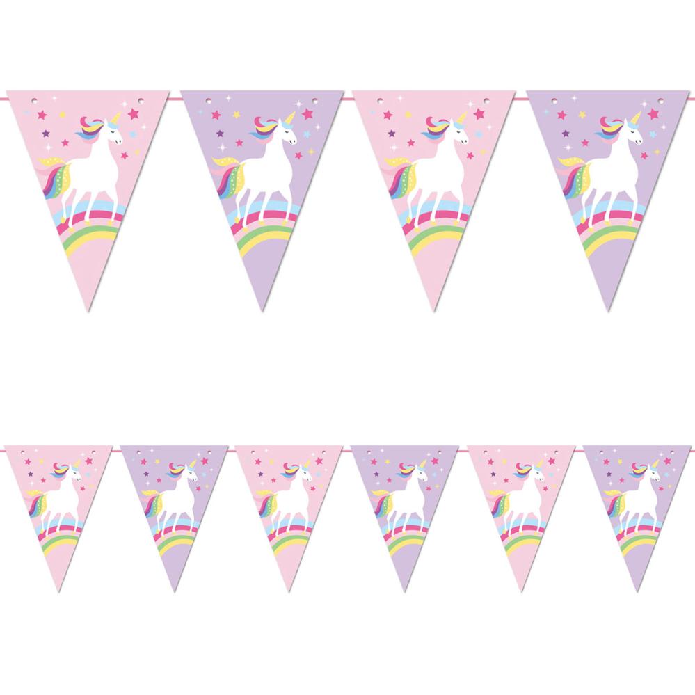 Enhjørning Vimpelguirlande omfatter en guirlande med vimpler, der er dekoreret med hver sin hvide enhjørning, en regnbue og flerfarvede stjerner på lyserød eller lilla baggrund. Guirlanden hænger på et lyserødt bånd.