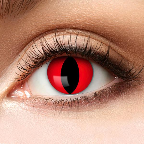 Farvede Crazy Linser Red Cat omfatter et par røde katteøjne med en smal, sort kattepupille. Linserne passer til voksne og kan bruges i op til 3 måneder.