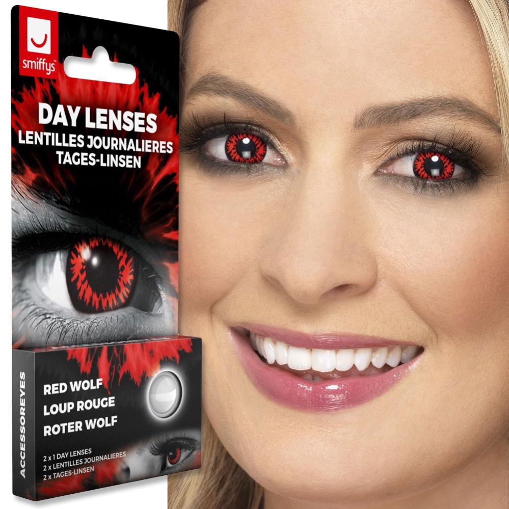 Farvede Linser Red Wolf er sorte med rødt mønster over hele linsen. Linserne er holdbare i 3 måneder efter åbning af pakken. Et godt valg til dig, der ønsker et skræmmende udseende!