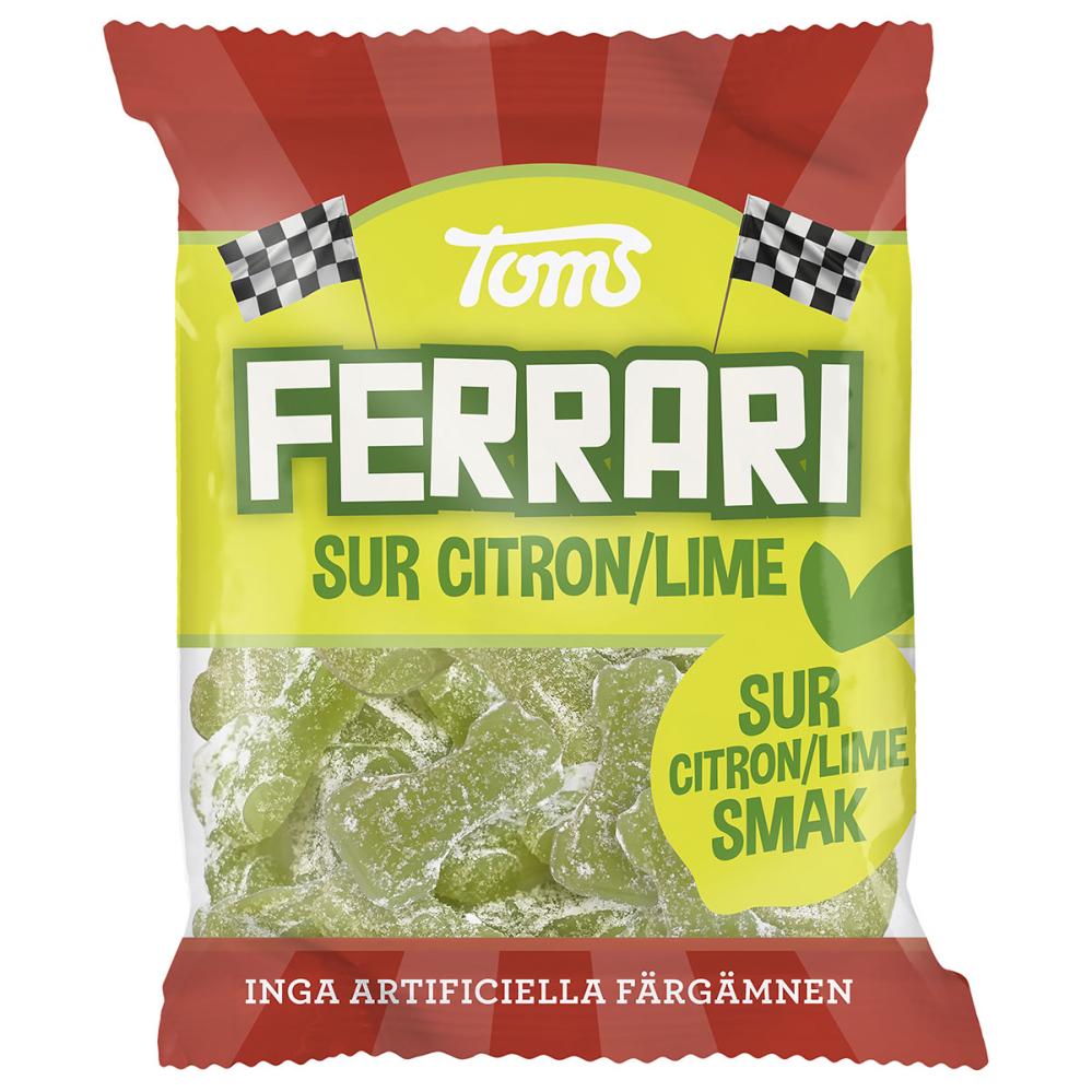 Ferrari Sure Vingummier 120g omfatter en pose med 30 sure vingummier med citronsmag i form af grønne Ferrari-biler.