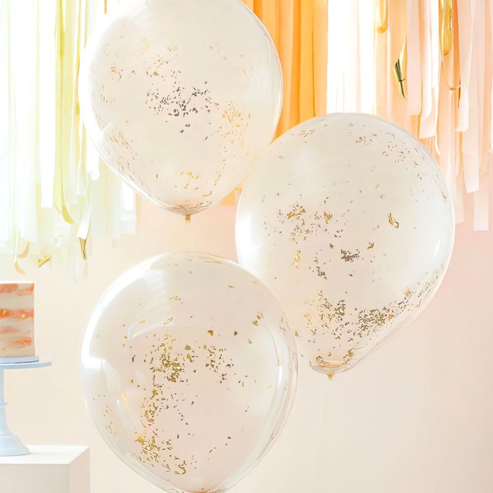 Ferskenfarvede Konfettiballoner Dobbelt Lag inkluderer 3 ferskenfarvede latexballoner med dobbelt lag og gylden konfetti indeni. Ballonerne fyldes med luft eller helium og bliver ca. 45 cm store.