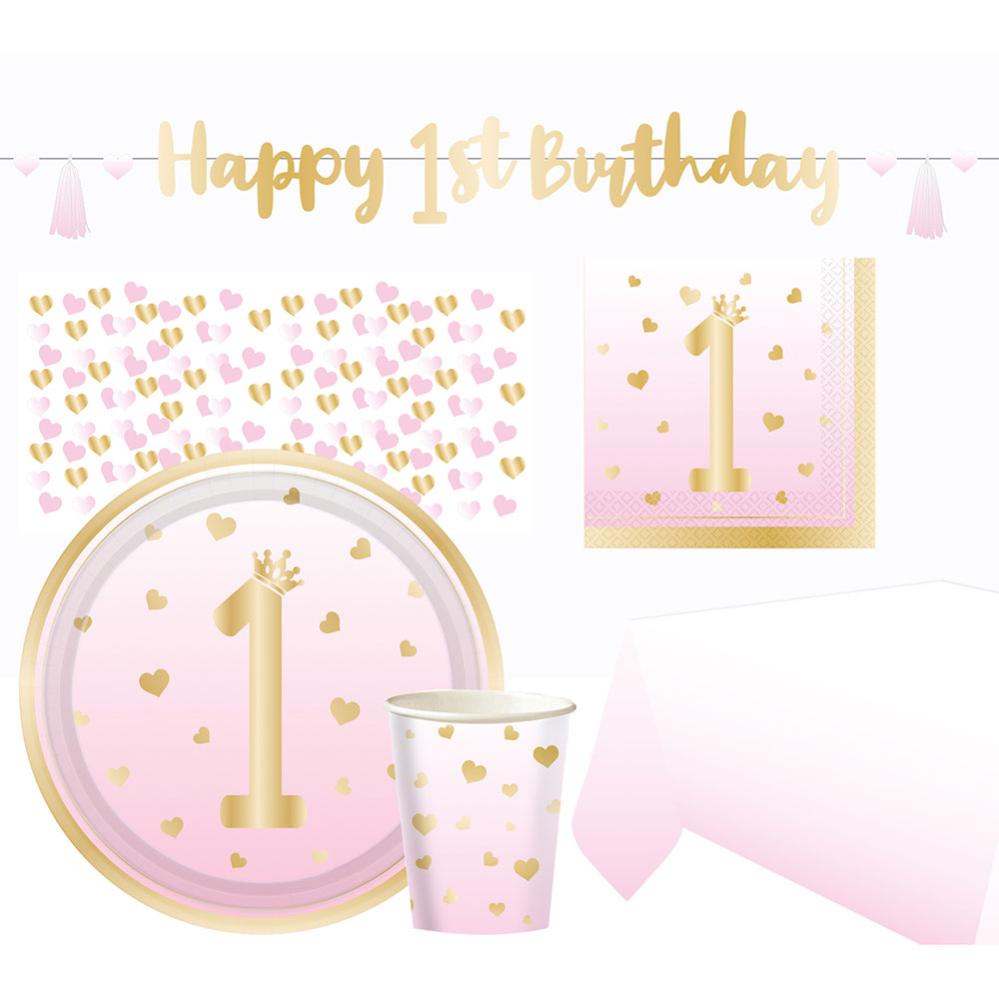 Festpakke 1 år Lyserød/Guld 35-pak omfatter et sæt til en 1-års fødselsdag i hvid, lyserød og guld.