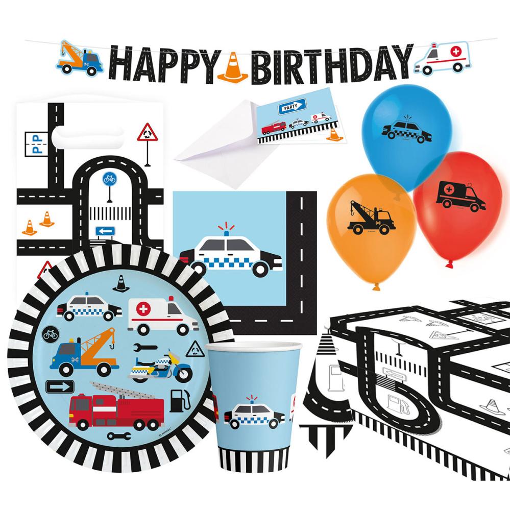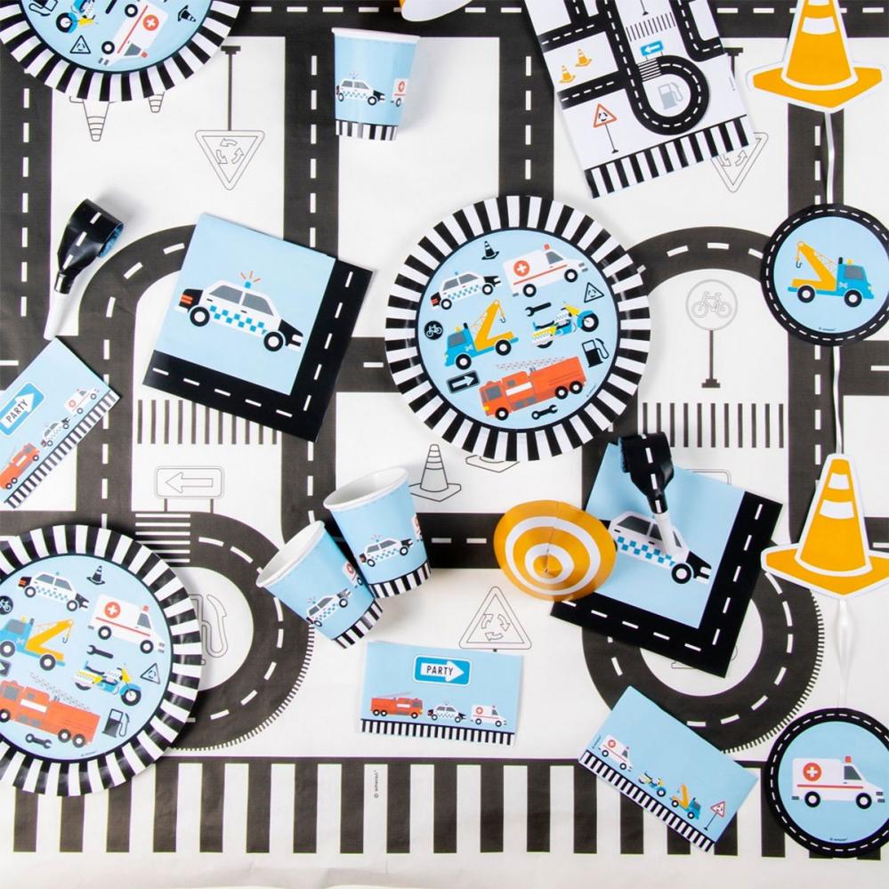 Giv festen fuld fart med Festpakke On The Road 60-pak. 60 dele i rød, hvid, sort, orange og blå skaber en borddækning med biler, veje, trafikskilte og legende detaljer. Perfekt til en børnefødselsdag med biler og køretøjstema.