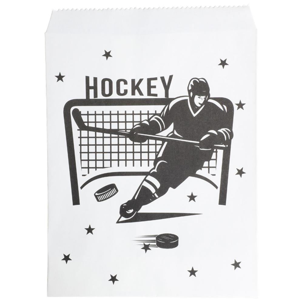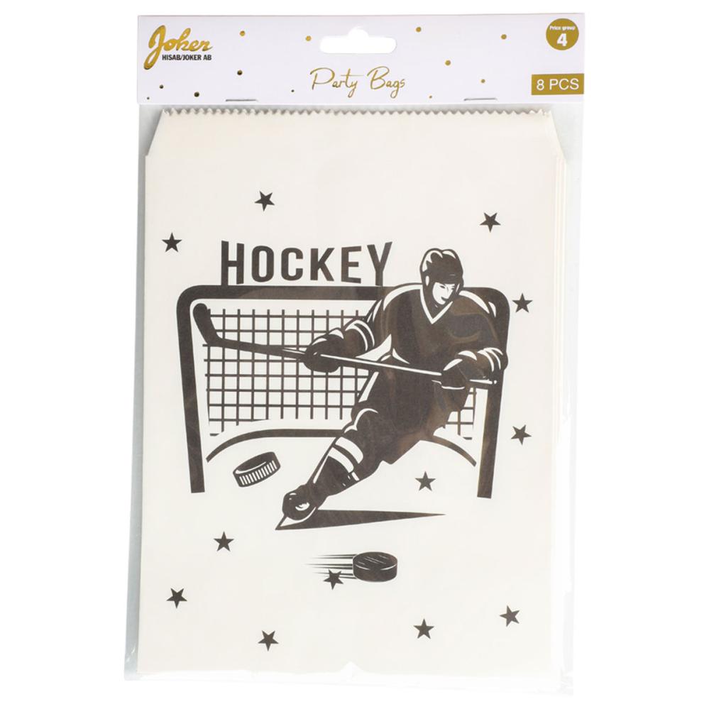 Festposer Hockey 8-pak består af otte hvide papirposer med et sort tryk på den ene side, som forestiller en skøjteløbende hockeyspiller, et hockeymål, stjerner samt teksten "HOCKEY".