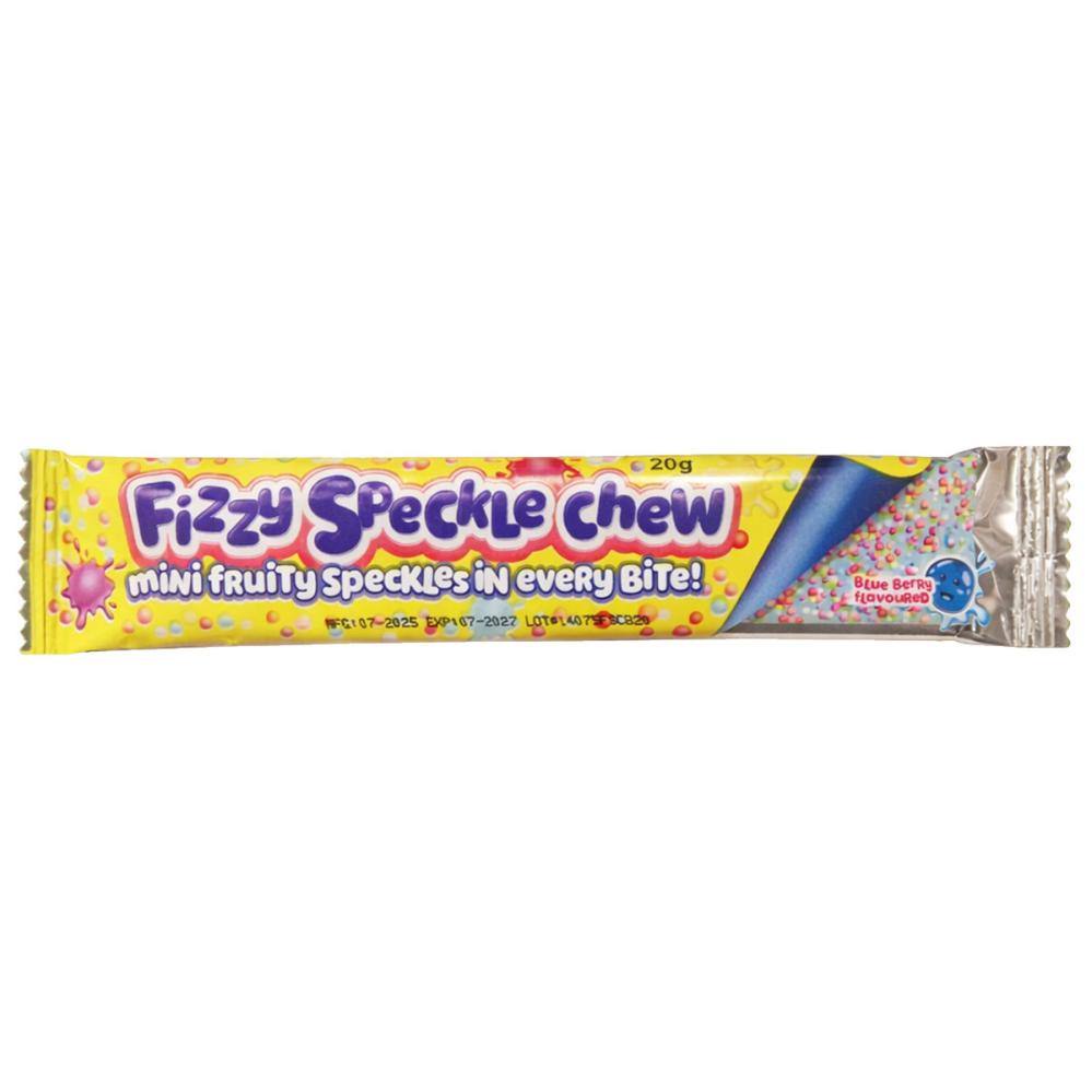 Fizzy Speckle Chew Blueberry 20g er en tygbar slikkepindestang med smag af blåbær, som er toppet med små, farverige frugtkrymmel for ekstra glæde og tekstur.