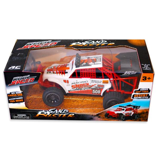 Fjernstyret Bil Sand Buster omfatter en fjernstyret bil i hvid, rød og sort samt en sort kontrol med to spaker til fremad/bagud og højre/venstre.