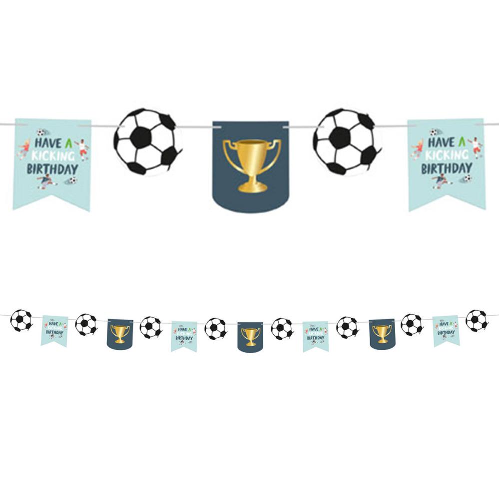 Flagguirlande Fodbold Fødselsdagsfest 6 m omfatter en guirlande med tre forskellige fodboldmotiver: fodbolde, pokaler mod en mørkegrøn baggrund, samt teksten "Have A Kicking Birthday" og fodboldspillere mod en salviegrøn baggrund.