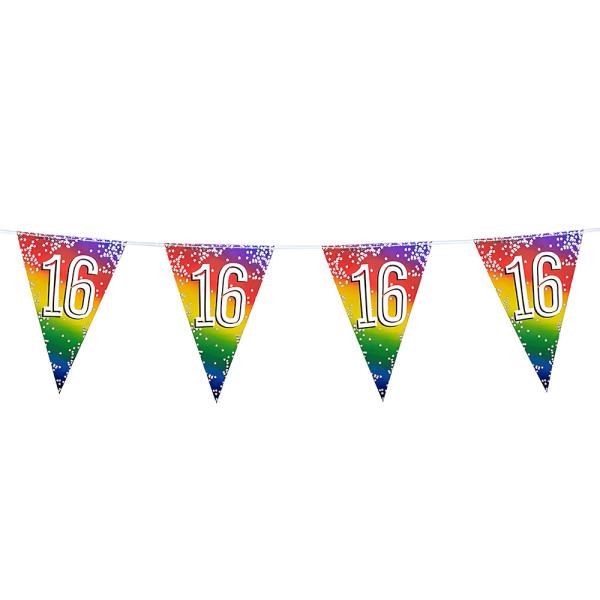 Flagguirlande Regnbue 16 år omfatter en 6 meter lang guirland med 15 flag med tallet 16 på en regnbuefarvet baggrund.