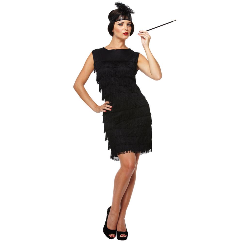Flapperkjole med Matchende Hovedbeklædning omfatter en sort frynset flapperkjole med et matchende pandebånd med pailletter og en fjer.