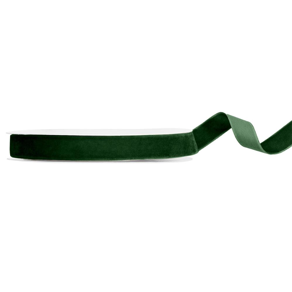 Fløjlsbånd Flaskegrøn 15 mm omfatter et flaskegrønt fløjlsbånd på rulle.