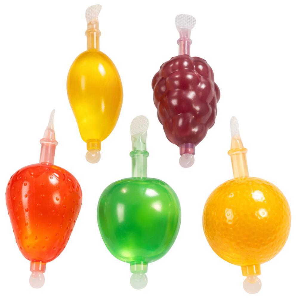 Flydende Frugtgelé 35 g er en flydende frugtgelé i en plastikform, der forestiller en frugt.