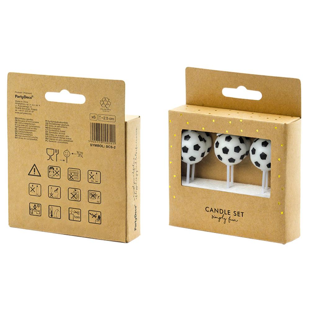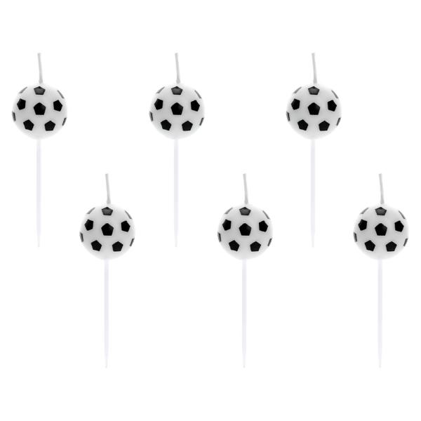 Fodbold Kagelys indeholder en pakke med seks kagelys i form af fodbold i hvidt og sort. Lysene er ca. 2,5 cm høje uden pind og sælges i en pakke med seks.