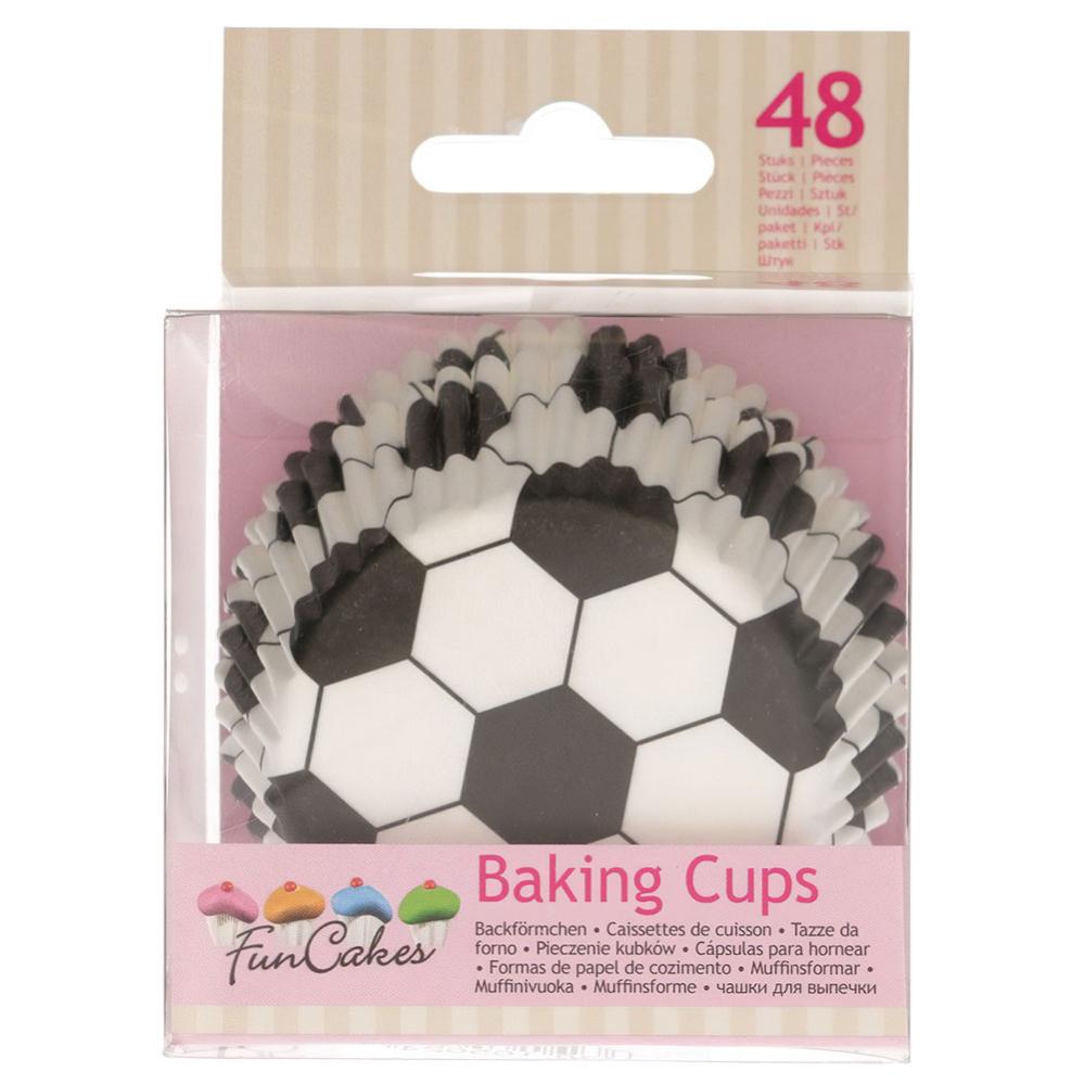 Fodbold Muffinforme omfatter en pakke med 48 muffinforme af pap med sort-hvidt fodboldmønster. Formene måler ca. 5 cm i diameter og tåler op til 220 grader.