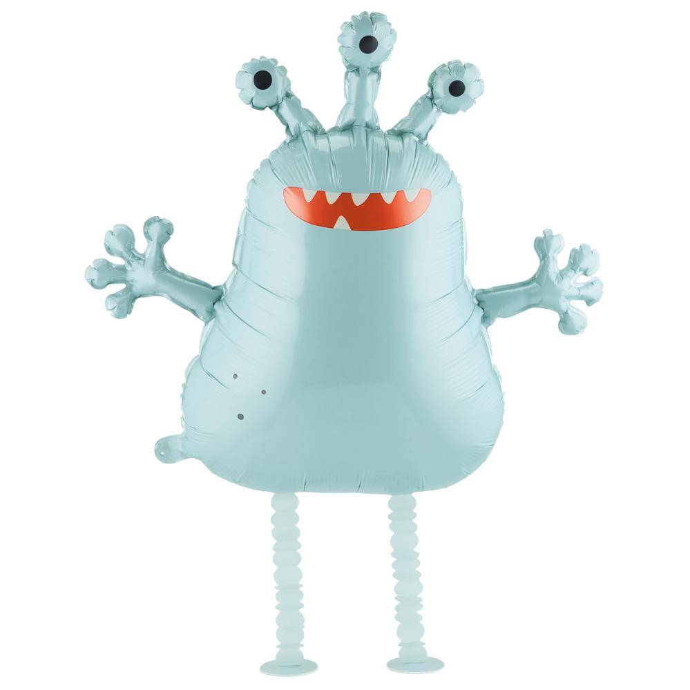 Folieballon Alien Airwalker 58 x 60 cm omfatter en folieballon i form af en diset blå alienfigur med små fødder og lange ben, som skaber en gående effekt, når den fyldes med helium. Ballonen kan også fyldes med luft og leveres med et sugerør til oppustning.