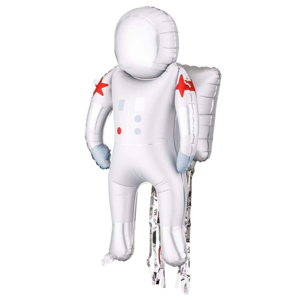 Folieballon Astronaut 45 x 81 cm er en ballon formet som en astronaut i hvid rumdragt med en rød stjerne rundt om begge overarme. Astronauten har en hvid pakke på ryggen med sølvfarvede foliesnore, som hænger ned. Ballonen fyldes med luft via det medfølgende pusterør.