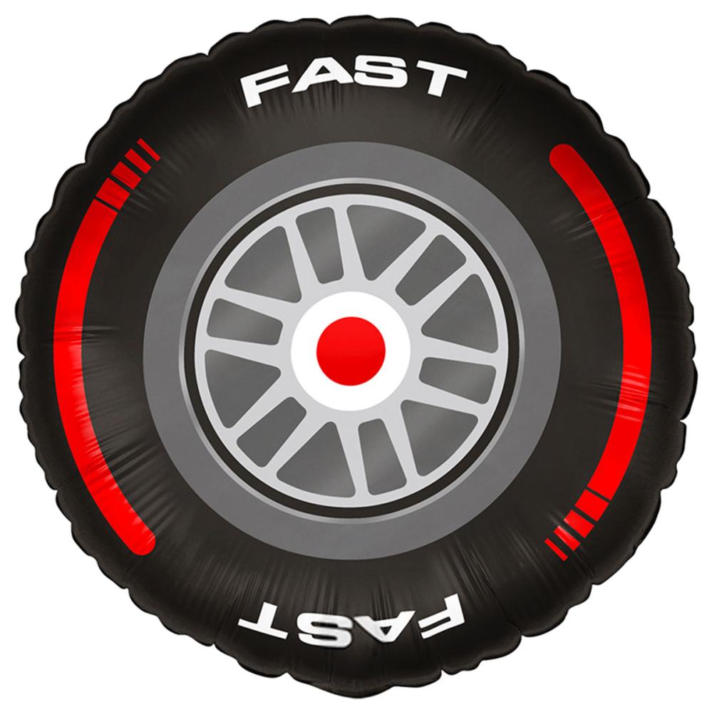 Folieballon Bildæk Racing 35 cm er en rund, sort folieballon med et racinginspireret dækmotiv, detaljer i rødt, gråt og hvidt samt teksten 'FAST' øverst og nederst.