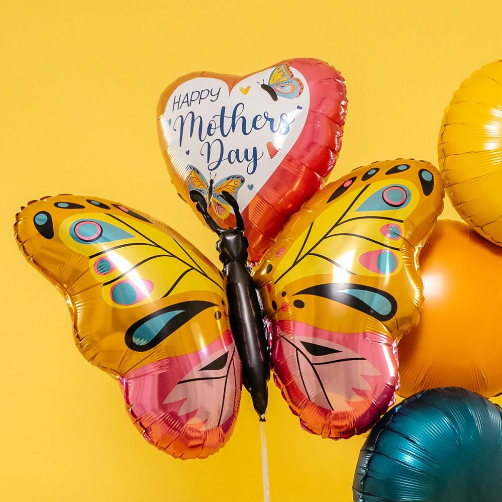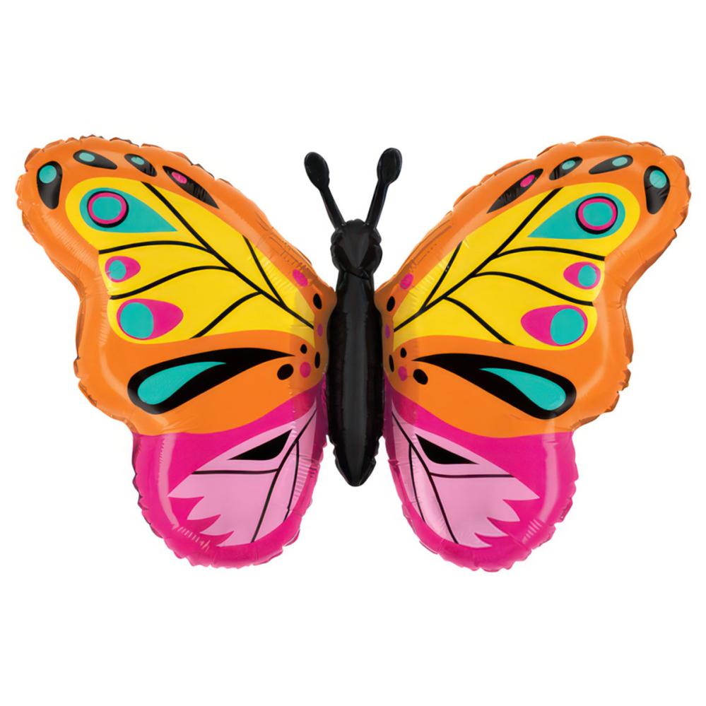 Forvandl sommerfuglefesten til et sprudlende dyretema med vores glitrende farverige folieballon i form af en sommerfugl. Vingernes mønstre i orange, gul, turkis, sort og rosa skaber uimodståelig feststemning til din dyrefest.