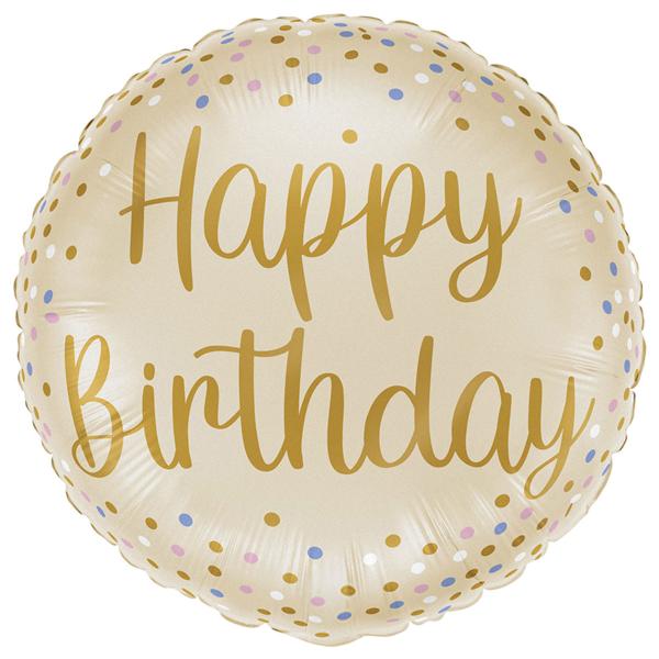 Folieballon Happy Birthday Cremefarvet 35 cm omfatter en rund, cremefarvet folieballon dekoreret med små prikker i forskellige farver langs ballonens kant og teksten 'Happy Birthday' i guld.